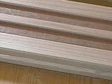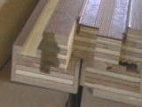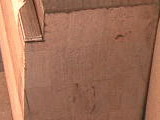 部屋の中はフローリングが張られたため、これを保護するシートが張られているため一見雑然とした感じ。このフローリングの接着剤は既に乾燥しているがプヨプヨしてゴムのようである。「以前はよくある木工用ボンドを使用していたが、今は弾性接着剤を使用している。」という事で、ゴムのような触感だが