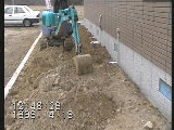 外では「今日から始めました。」という外構工事と、水道管用の穴を掘る工事が始まっていた。外構は駐車場のコンクリートを止めたし(枕木に変更)、アプローチも入り口部分しかお願いしなかったため「たいした工事はしないだろう。」と思っていたのだが結構広範囲に掘り返していた。以前、電柱の影に息子が拾ってきたドングリを埋めており、これが発芽する事を楽しみにしていたのだが、既に影も形もなし。残念。