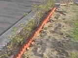 山砂の流出が著しいため、土留めのレンガを置く事にする。当初の予定では『なだらかな傾斜をつけて芝を貼る』予定だったのが、単なる二段植採になってしまった。